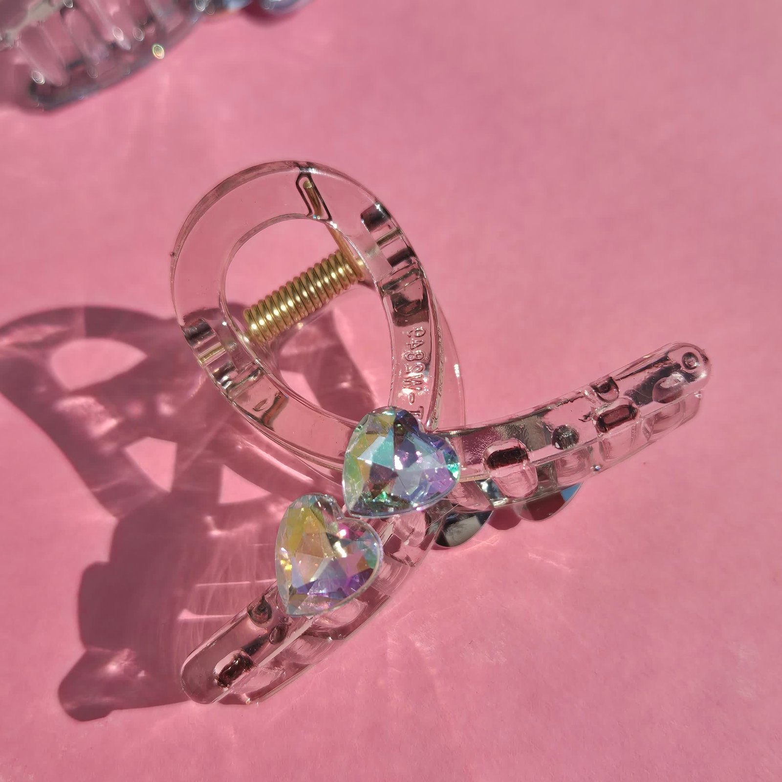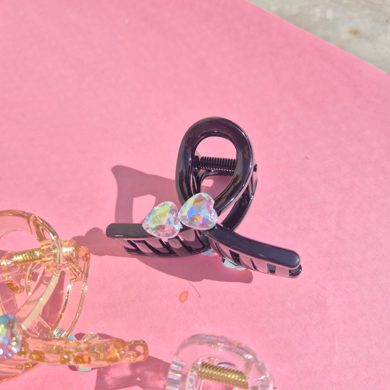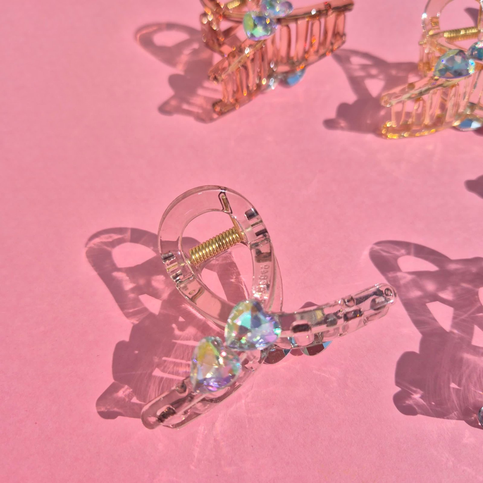 Elevate your hairstyle with this elegant transparent hair claw clip, designed with a sleek, crystal-clear acrylic body and adorned with dazzling heart-shaped rhinestones. The iridescent hard stones shimmer beautifully under the light, adding a touch of sparkle and glam to any look. Durable yet stylish, the sturdy gold-tone spring provides a secure grip, making it perfect for everyday wear or special occasions.